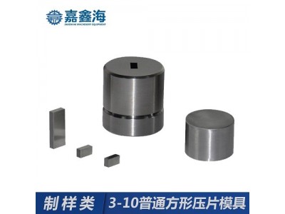 嘉鑫海3-10mm方形壓片模具適用于一些易成型的細長條樣品的壓制,壓片寬度3-100mm,特殊規格尺寸模具可根據客戶要求來定做。模具材質為CR12模具鋼,軟硬兼適。使用時注意不要超壓,否則容易造成壓桿變形卡死,導致模具報廢。