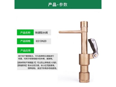 P-33快速取水閥(又稱取水栓、方便體)用于從地下管路系統臨時取水。也可接上軟管后進行手動灌溉或沖洗車輛、道路等,即插即用,即拔即止。 帶O型密封墊圈,止水效果好。規格有3/4"、1"等,材質有塑鋼和銅質特點: