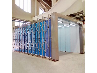 伸縮式噴漆房采用活動式框架結構,內襯玻璃纖維防火篷布,通過進出口門頭處的驅動電機,通過軌道帶動整體結構進行伸縮運動;非工作時間可將噴漆房整體折疊,***節省了車間場地,作業時根據實際情況調節入口處卷簾,控制補風,從而提高作業時產生漆霧的回收效果。