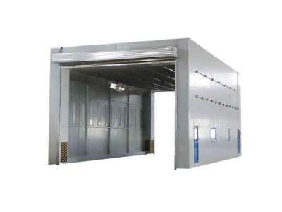 整體移動式噴漆房主要應用于大型工件的打磨或噴漆工作中,方便收集工作中產生的粉塵或廢氣。在一般情況下每套房體設設置有2-3個排風凈化工位,哪個工位上的工件需要噴漆時,房體則行走移動到那個工位,其他工位可以繼續打磨工作,待房體內的工件噴漆完畢后,再控制移動房體行走到打磨完畢的工件工位,如此設計可以實現大型工件的不間斷連續噴漆工作。房體為鋼結構構造,房體立柱下面設置有兩臺電動驅動行走機構,行走機構沿地面軌道行走。移動房體兩端設置有電動卷簾大門,房體行走時,大門升起,待到達位置時,大門降落關閉。大門與行走機構由電氣控制部分連鎖控制,大門完全升起后,房體才可移動行走。 一種是側進風(或房頂部)、側排風。這種排風設計管道在房體之外,長度與整體移動房體的大行程相同。外側排風管道上設若干個電動風閥,而在房體側面設置若干個噴漆或打磨工位,并在此處通過伸縮汽缸實現與排風管道的自動對接。漆霧收集采用玻纖地棉過濾,過濾棉框嵌入噴漆房墻體的排風一側,而另一側墻體或者房頂設置進風過濾系統。另外一種排風方式是上進風、下排風。這種設計為地溝排風,漆霧廢氣通過地溝引向漆霧處理器,干式或者濕式漆霧處理設備都可以。漆霧處理器可設置在不影響其他工作的任意位置。主體地溝的長度應與房體的行程相同,地溝上面封閉,可設置電動風閥,按照工作的實際情況打開或關閉風閥。也可以排風口上面設置格柵,并設有密封門,房體行走到那個工位,就把對應的排風口打開。采用地溝方式排風,進風過濾系統設置在房頂。