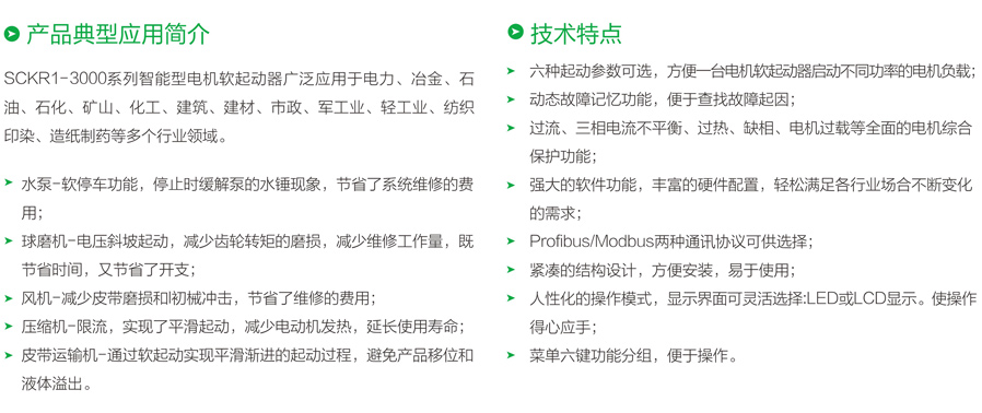 川肯SCKR1-3000系列軟啟動器廣泛應用于電力、冶金、石油、石化、礦山、化工、建筑、建材、市政、輕工業、紡織印染、造紙制藥等多個行業領域。