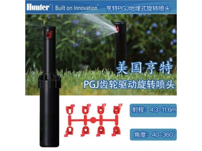 亨特PGj-04地埋式旋轉噴頭 獨特的旋轉機構,噴頭的旋轉速度不隨噴嘴的大小和壓力的變化而改變 頂部橡膠保護蓋,防止污物進入和機械或人踏對噴頭的損壞 低壓噴灑性能好 內置大過濾網,有效防止噴嘴的堵塞 可靠的齒輪驅動機構 安裝和調節簡便 噴嘴型號選擇多,適應范圍廣 進口尺寸:1/2" 射程:6-10m