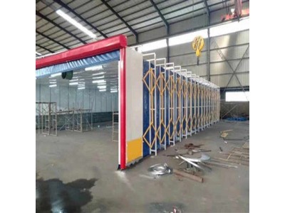 伸縮式噴漆房采用活動式框架結構,內襯玻璃纖維防火篷布,通過進出口門頭處的驅動電機,通過軌道帶動整體結構進行伸縮運動;非工作時間可將噴漆房整體折疊,***節省了車間場地,作業時根據實際情況調節入口處卷簾,控制補風,從而提高作業時產生漆霧的回收效果。