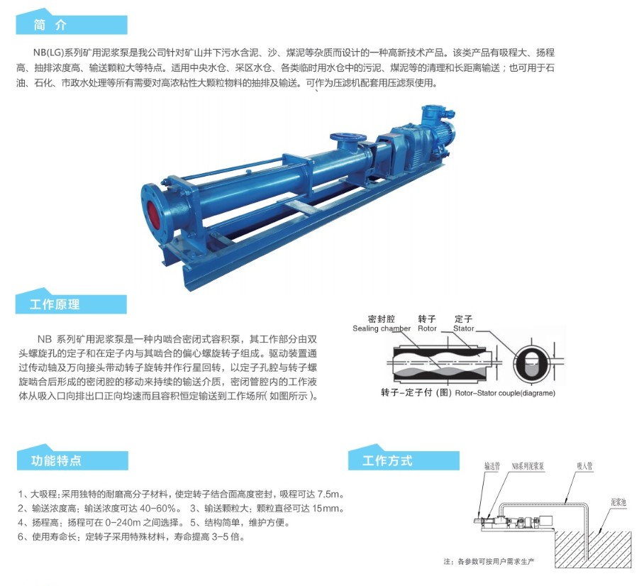 NB系列礦用泥漿泵是一種內(nèi)嚙合密閉式容積泵,其工作部分由雙頭螺旋孔的定子和在定子內(nèi)與其嚙合的偏心螺旋轉(zhuǎn)子組成。驅(qū)動(dòng)裝置通過傳 動(dòng)軸及萬向接頭帶動(dòng)轉(zhuǎn)子旋轉(zhuǎn)并作行星回轉(zhuǎn),以定子孔腔與轉(zhuǎn)子螺旋嚙合后形成的密閉腔的移動(dòng)來持續(xù)的輸送介質(zhì),密閉管腔內(nèi)的工作液體從吸入 口向排出口正向均速而且容積恒定輸送到工作場所。