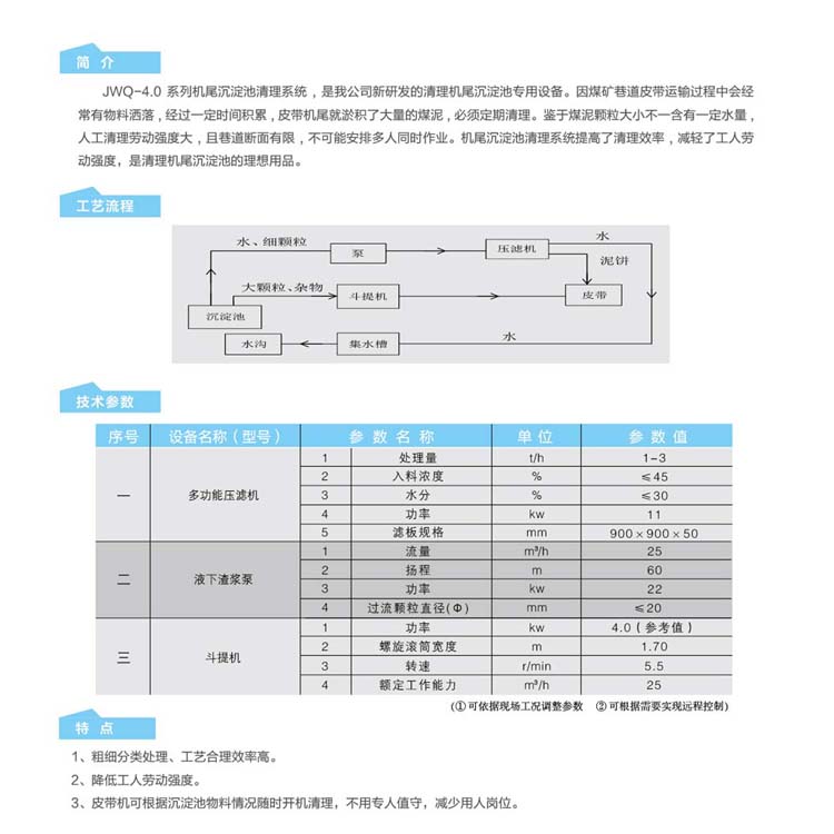 JWQ-4.0系列機(jī)尾沉淀池清理系統(tǒng),是我公司新研發(fā)的清理機(jī)尾沉淀池設(shè)備。因煤礦巷道皮帶運(yùn)輸過程中會(huì)經(jīng)常有物料灑落,經(jīng)過一定時(shí)間積累,皮帶機(jī)尾就淤積了大量的煤泥,必須定期清理。鑒于煤泥顆粒大小不一含有一定水量,人工清理勞動(dòng)強(qiáng)度大,且巷道斷面有限,不可能安排多人同時(shí)作業(yè)。機(jī)沉淀池清理系統(tǒng)提高了清理效率,減輕了工人勞動(dòng)強(qiáng)度,是清理機(jī)尾沉淀池的理想用品。