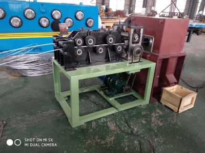 1 機組用途 本機組用于將¢9.5mm、¢12mm 鋁桿剪切成鋁丸。 2 機組外形及組成 設備組成: 1 立式放線架 2 臥式放線架 3 進線導輥 4 校直裝置 5 控制箱 6 牽引裝置 7 切丸機頭及傳動 8 料箱(自制) 3 技術規(guī)范 切刀旋轉(zhuǎn)直徑 ¢360 剪切桿經(jīng) ¢9.5;¢12 切桿頭數(shù) 雙頭(可以同時進兩根桿子) 切丸最大長度(可修改設計) 31mm 切丸最小長度(可修改設計) 10mm 最大送料速度 752mm/s 產(chǎn)量(單頭) ¢9.5x31mm 500Kg/h 牽引電機功率 5.5KW 變頻 牽引減速機 BWY13-17-5.5 最大牽引力 7580N 機頭電機 11KW 4 特點簡述 1)對于松散型線卷,采用立式放線架,向上引拉,防止亂線。雙放 線,互不干涉。 2)對于緊密型線卷,采用傾斜臥式放線架,便于叉車上料,通過中 心抽頭放線。放線架出口兩根導輥擋住,防止亂線。 3)臥式放線架不固定,可一走。不影響立式放線。 4)放線通過校直輪校直,防止在進線管里立堵塞。 5)牽引輪為雙主動,由 5.5KW 電機、針擺機、鏈輪傳動,變頻調(diào)速。 主鏈輪與從鏈輪可以對換。 6)機頭由電機、皮帶輪傳動,大皮帶輪帶飛輪功能。全封閉,雙層 罩殼。 7) 5)操作臺使用觸摸屏操作,在觸摸屏上輸入牽引電機頻率,改 變送料速度,實現(xiàn)所需的剪切長度。