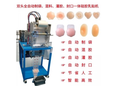2. 往雙頭全自動一體成型乳貼機添加脫好泡的A、B膠及TPU膜,開機啟動程序,設備自動制袋、混膠、灌膠、封口等生產流程;生產效率300-350對/小時;