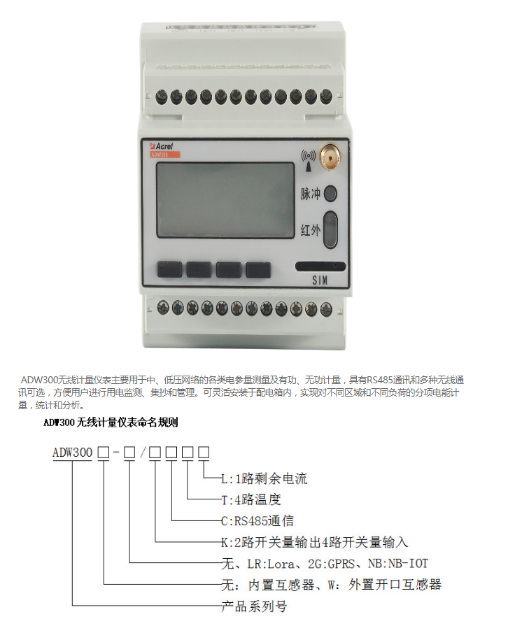 概述:ADW300無線計量儀表主要用于中、低壓網絡的各類電參量測量及有功、無功計量,具有RS485通訊和多種無線通訊可選,方便用戶進行用電監測、集抄和管理。可靈活安裝于配電箱內,實現對不同區域和不同負荷的分項電能計量,統計和分析。